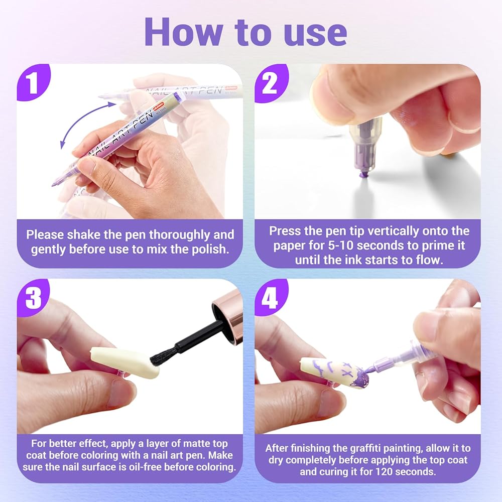 The fine tip pen design allows smooth control for drawing lines, patterns, florals, and creative designs on natural, gel, acrylic, or artificial nails. The quick-dry and waterproof formula ensures long-lasting results without smudging.